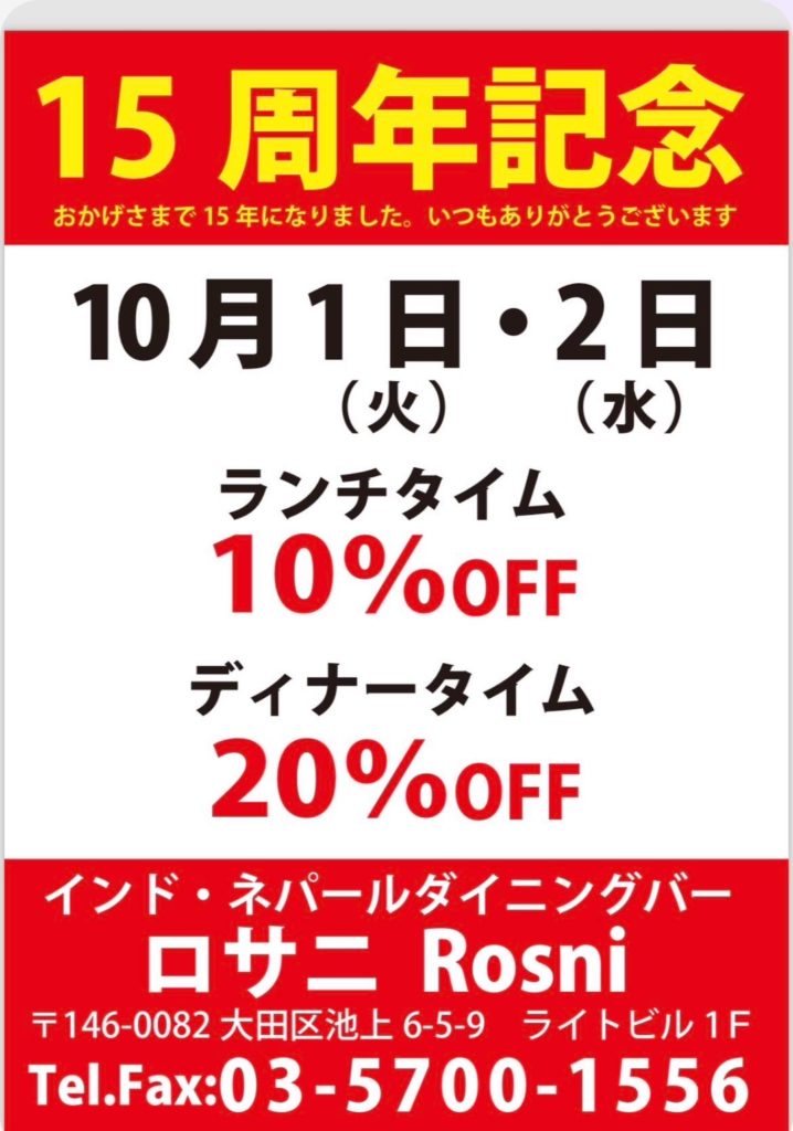 いつもインド・ネパール ダイニングバー ROSNI(ロサニ)をご利用いただき、誠にありがとうございます。このたび、ROSNIは開店15周年を迎えることができました。